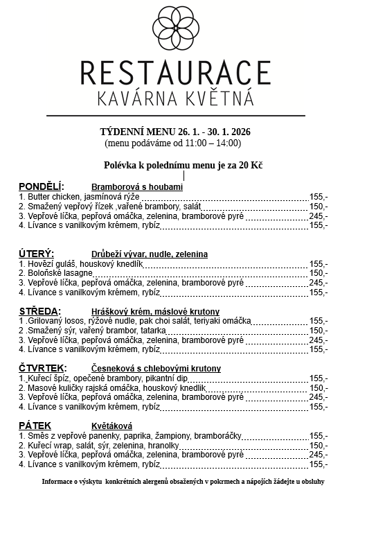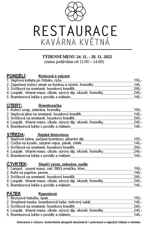 | Čtvrtek | 11:00 – 21:00 hod. | vaříme do 20:00 |
